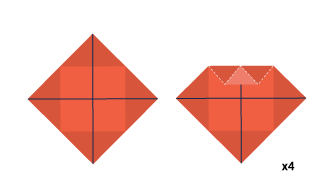 Brjóttu litlu þríhyrningana sem eru efst uppi ofan á hliðarþríhyrningana. Þegar búið er að brjóta þá inn, brjóttu þá hliðarþríhyrningana tvo saman sem eru enn í heilu lagi. Brjóttu þá þannig saman að þeir nái skorunni algjörlega.