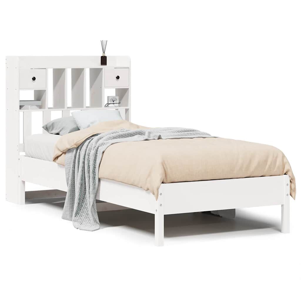vidaXL Rúm með Bókahillu án Dýnu Hvítt 75x190 cm Gegnheil Fura